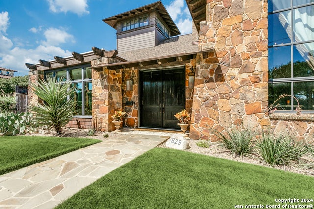 Discover this striking custom-designed home nestled on a sprawling lot in the coveted community of Terrell Hills. The expressive stone exterior sets the stage for the exquisite craftsmanship found inside. Step into a grand interior featuring soaring ceilings with exposed beams, walls of windows that bring in abundant natural light, and rich wide-plank wood flooring. The impressive culinary kitchen is a chef's dream, boasting a commercial-grade gas stove, a stunning wood-detailed vent hood, a spacious gathering island, chic open shelving, and a large walk-in pantry. Designed for effortless entertaining, the kitchen seamlessly flows into the living and dining areas, anchored by dual-sided stone fireplaces that add warmth and elegance. The main level offers three spacious bedrooms, while the primary suite occupies the upper level, showcasing a vaulted ceiling, a cozy fireplace, and a luxurious spa-inspired bath with a soaking tub, walk-in shower, dual vanities, and an expansive walk-in closet. Ascend to the third-floor office or fitness room, which opens to a private balcony offering breathtaking city views. Step outside to the covered patio, perfect for year-round enjoyment, overlooking a private, beautifully landscaped yard with mature trees. This one-of-a-kind property is a true retreat, offering both style and serenity.