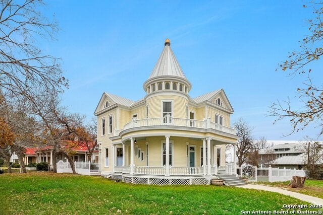 Step into the timeless elegance of 805 Nolan Street, a breathtaking Queen Anne Victorian home built in 1906 one of the most successful entrepreneurs of the late 1800s and early 1900s - Ed Friedrich. The "Friedrich House" provided luxury and comfort while allowing Mr. Friedrich a clear view and quick access to his factory a few blocks away. This meticulously restored property radiates historic charm while offering modern comforts, making it a true architectural masterpiece in one of the city's most sought-after neighborhoods. Upon arrival, a grand wraparound porch sets the tone for the home's character and charm. Step inside to an inviting foyer, where a beautifully crafted antique staircase invites you to ascend. 8-foot-tall vintage pocket doors make an grand entrance to the octagonal living room, where a fireplace, tall windows, and original, long-leaf, pine floors await all social gatherings. The homes exquisite elements instantly add elegance to every event. With minimal holiday decor, your real memories will replace any greeting card or classic Christmas movie scene. Throughout the home, tall doors are capped with original glass transoms and period matching cast iron molded hardware. Each room suspends its own unique chandelier with arrays of draped German crystals or French lamp shades. Even the long hallways and staircases exhibit candelabra chandeliers. 6-foot tall windows create unique juxtapositions of shadows and light on the curved walls and arched entries during the day as the sun's changing position dictates. Once the sun sets, the opulent lighting cascading from tall windows, causes traffic to slow and even stop in awe. The 1st floor also features a versatile flex space for a bedroom, office, or library. The dining area flows seamlessly into the grand kitchen, creating an ideal space for entertaining with a view of the city skyline as a back drop to the park. The artistically and masterfully hand-crafted banisters in the grand and servant stairways lead you aloft to five generously sized bedrooms and two full baths, perfect for family and guests. Step out onto the wide wraparound balcony where breathtaking views of downtown high rises, Hays Street Bridge, Alamodome, and Dignowity Park remind you why you love this city. Every detail, from crown molding to the intricate woodwork of the 175 banister spindles, reflects the care and admiration provided to this property over the past century. Situated in the vibrant Dignowity Hill neighborhood, 805 Nolan St. is perfectly positioned across the street from Dignowity Park, offering green space, picnic amenities, dog park, playground, basketball, and community events. The perpetual unobstructed view of downtown over the park palms and tree tops provides enjoyment of amazing sunsets and downtown fireworks. The Pearl, Alamodome, Hemisfair Park, and the highly anticipated Project MARVEL are minutes away, placing you in the heart of fine dining, entertainment, and cultural attractions. All this, minus long drives or hassles with parking. With its combination of historic charm, modern updates, and unbeatable location, 805 Nolan St. offers a rare opportunity to own a piece of the city's rich history with endless future possibilities. Whether you're looking for an amazing residence for your child's first memories, a lucrative investment, a multi-generational home, or just a perfection vacation spot, this stunning and unique property is a must see!