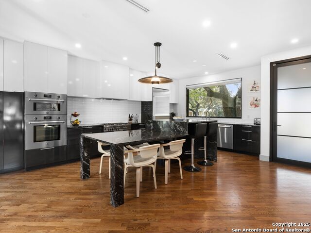 A rare find in Alamo Heights ISD-this sleek modern retreat is easily one of the best values on the market right now. Nestled at the end of a quiet cul-de-sac and shaded by heritage oaks, the home blends architectural sophistication with everyday livability. Walls of glass fill the interiors with natural light, showcasing rich original oak floors and a dramatic, open-concept design anchored by a striking dual-sided fireplace. The Italian-inspired kitchen is a true showpiece, outfitted with premium Bertazzoni appliances, Black Forest granite, custom cabinetry, and an oversized island built for entertaining. The primary suite is a private sanctuary with its own fireplace, spa-like bath with a freestanding soaking tub, a 13-foot vanity, and an expansive walk-in closet. Outside, low-maintenance xeriscaping and a turf backyard create the perfect setting for easy living. A spacious deck shaded by a majestic oak offers the ultimate spot for morning coffee or evening gatherings. Energy-efficient upgrades-spray foam insulation, newer roof, updated HVAC, and modern lighting-deliver peace of mind along with style. Listed under appraised value, this home presents an exceptional opportunity in one of the city's most desirable school districts. With motivated sellers and a prime location just minutes from shopping, dining, and coffee favorites, this is more than a home-it's the complete lifestyle package. Homes of this caliber and location rarely come available at this price point-don't miss your chance to claim it.