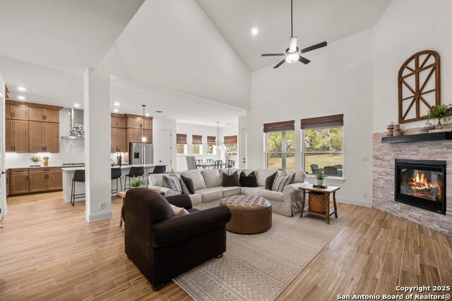 Experience modern luxury in this stunning home nestled in a private cul-de-sac in sought after Royal Oak Estates! This home has everything you desire and much more! Step inside this 5 bedroom + 3.5 baths home to an inviting and spacious open concept living. This versatile floorplan offers 3 bedrooms downstairs. The gourmet kitchen is truly an entertainer's delight with stainless steel built-in appliances, double ovens, granite countertops, large island, pantry, custom cabinets to the ceiling for ample storage and an inviting eat-in kitchen surrounded by large windows for plenty of natural light. The kitchen space flows effortlessly into the family room with 20ft ceilings and a gas fireplace for seamless entertaining. The main level and spacious primary suite features high ceilings, large windows and a spa-like bath with granite top double vanities, a soaking tub, a separate shower and walk-in closet. The secondary guest ensuite offers privacy to your family and friends when they visit. Across from the primary bedroom is a secondary bedroom that is a versatile flex space for a nursery, hobby or exercise room. A spacious study with glass French doors for the ideal home office completes the downstairs. Continue upstairs, where you will find a game room and 2 bedrooms with large closets that share a bathroom. Watch your favorite movies in the large media room. Attention to detail is evident throughout the home including the perfect spot for your furry pet underneath the stairs. The home boasts plenty of storage that makes organization easy. Enjoy the Texas nights in your extended covered patio & the oversized backyard that is ready for the pool of your dreams. Don't forget about the spacious 3-car garage with ample space for overhead storage. Conveniently located in north central SA, Royal Oak Estates residents will enjoy plenty of shopping & dining options with nearby walking trails, the Guadalupe River and Canyon Lake perfect for the nature enthusiast. Enjoy no city taxes and highly desired Comal ISD schools, including the new Bulverde Middle School and Pieper High School. Don't miss this opportunity to own this exceptional home!