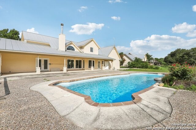 Welcome to your secluded retreat in Oak Springs! Nestled on over 2 acres of lush privacy, this captivating two-story single family home offers the perfect blend of tranquility and luxury. Step inside to discover soaring high ceilings and an inviting open floorplan bathed in natural light, creating an airy and welcoming atmosphere. The kitchen is a chef's delight, featuring ample space adorned with pristine white cabinets, complemented by light countertops and gleaming stainless steel appliances. It effortlessly flows into the living room where a majestic fireplace stands as the centerpiece, adding warmth and charm to your gatherings. The primary bedroom, conveniently located on the main level, boasts a spacious five-piece en suite bathroom, providing a serene retreat within your own home. Upstairs you'll find additional bedrooms, each offering comfort and versatility, alongside a flexible space ideal for a home office or recreation area. Outside, your backyard oasis awaits, complete with a sprawling patio perfect for entertaining or simply relaxing in the sun. A bright and expansive in-ground pool overlooks acres of your own private land, ensuring endless opportunities for outdoor enjoyment and peaceful moments. The home was completely remodeled within the last 10 years, with approximately 600sqft of additional living space. The home also includes an energy saving Geo Thermal System for both the HVAC and water heater. Embrace the lifestyle you've been dreaming of in this exceptional Oak Springs residence.