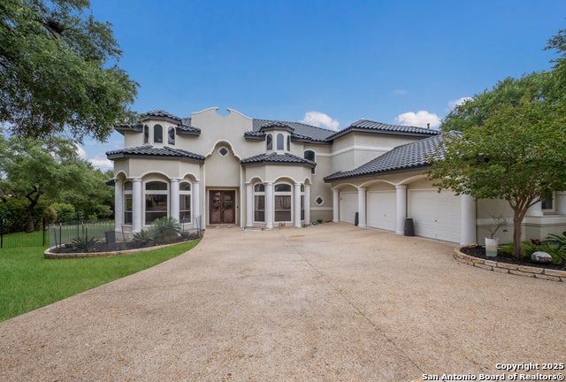 Welcome to 2435 Winding View, an exquisite Mediterranean-style estate tucked away in the prestigious guarded community of Summerglen. This custom home blends elegance and comfort across a thoughtfully designed layout with 4 bedrooms, 4.5 baths, a private media room, executive office, and over 5,000 square feet of elevated living space. From the moment you arrive, the circular drive and commanding tile rooflines create a striking first impression. Step inside to discover soaring ceilings, rich wood floors, and architectural columns that frame a flowing floor plan ideal for both grand entertaining and intimate living. The chef's kitchen is a true showpiece-featuring a large center island, gas cooktop, granite countertops, dual dishwashers, and expansive cabinetry with display glass. The open-concept design connects seamlessly to the spacious living room with a floor-to-ceiling fireplace and natural light pouring in through oversized windows. Your luxurious primary suite is tucked away on the main level, offering a spa-inspired bathroom with a soaking tub, walk-in shower, and awalk-in closet. Upstairs, you'll find generously sized secondary bedrooms, a dedicated media room with a star-lit ceiling, and plenty of storage throughout. Step outside and enter your own private retreat. A sparkling pool, outdoor kitchen with built-in grill, covered pavilion with mounted TV, wood-burning fireplace, and lush greenbelt views create the ultimate setting for entertaining or unwinding under the Texas sky. And for peace of mind-this home includes a storm-ready safe room with concrete walls, perfect as a gun room, prepper station, secure storage space, or wine cellar. Additional highlights include: 3-car garage Gated community with 24-hour security Custom lighting, art niches, and designer touches throughout Highly rated NEISD schools Minutes from shopping, dining, and golf at The Club at Sonterra 2435 Winding View is more than a home-it's a lifestyle. Schedule your private tour today and experience the perfect fusion of sophistication, comfort, and security.
