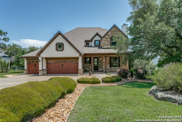 Enjoy resort-like living with stunning views in Bloomfield Hills gated community. This Texas Hill Country-style stone and stucco home has a welcoming covered front porch and is situated on over a half acre lot. The entry leads you to the formal living area with stone fireplace and a separate formal dining area with a remarkable stone accent wall. The bright, open island kitchen is open to the second living area and casual dining space and features views of the back yard retreat. From this area, access the covered porch with grilling bar and outdoor fireplace overlooking the pool, patios and expansive yard beyond. The primary suite is on the main level with a stunning bathroom complete with spa tub and walk-in dual shower, walk-in closet, and adjacent study or work-out room. 4 secondary bedrooms are upstairs with a game room and separate media room. Balcony with amazing views is accessed from the game room. 3 Car garage, all with Tesla charging stations.