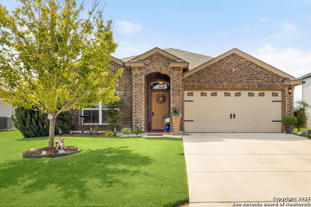 REDUCED! Meticulously maintained single-story home featuring 3 bedrooms and 2 bathrooms with an open-concept kitchen and living room design. The fully landscaped yard includes crepe myrtles, a burr oak, and lush Bermuda grass, all supported by a 5-zone WiFi-enabled sprinkler system. Enjoy the outdoors under a white pergola on the 16x16 east-facing patio-perfect for morning coffee or evening shade. The private backyard also offers a producing vegetable garden, ready for summer harvest, and motion-sensor solar lighting for added convenience and security. An immaculate Tuff Shed with windows and built-in shelving provides ideal space for gardening tools or additional storage. Located across the street from the HOA pool and playground, this home blends comfort, privacy, and community amenities. Walking/jogging/bike path in the community! Great location, just minutes from Seguin, TX, grocery shopping, restaurants, and hospital wellness center!