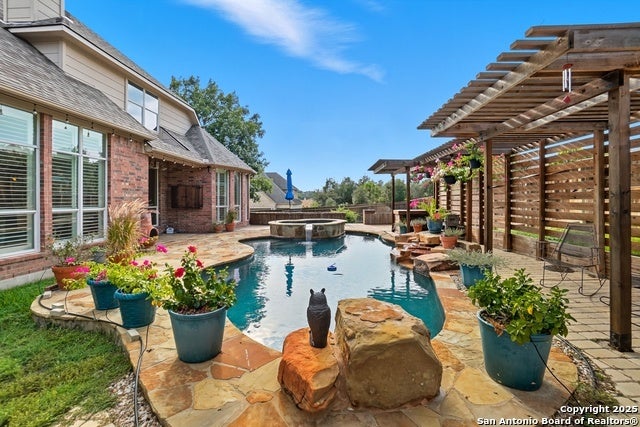 Nestled in the gated enclave of the Stone Oak Mesa Grande, this stately residence sits on a beautifully landscaped .36-acre lot. Featuring five bedrooms plus a dedicated study, the layout includes a private upstairs guest suite-ideal for visitors or multigenerational living. The expansive open-concept living room impresses with soaring ceilings, abundant natural light, and a cozy gas fireplace. The spacious island kitchen features gas cooking, extensive cabinetry, and generous prep space for any culinary endeavor. Upstairs offers a large second living room- perfect for media, play, or fitness, and a versatile bonus room. The primary suite is a peaceful retreat, complete with a sitting area. Step outside into a resort-style backyard oasis, highlighted by a custom heated pool and spa designed by Keith Zars Pools. Surrounded by mature landscaping and ample patio space, it's perfect for year-round entertaining. Additional highlights includes abundant storage space in the garage.