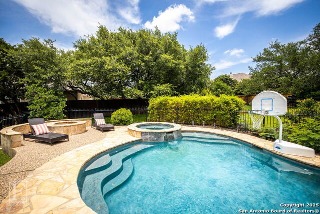 4 bedroom 3 bath McNair Home in a prime North Central San Antonio Location is nestled on a beautifully treed lot, this home blends elegance, comfort, and thoughtful design-from the three-car side-entry garage to the abundance of natural light throughout, every detail has been carefully curated for elevated living. Step outside to your own private retreat-complete with a sparkling in-ground pool, relaxing hot tub, cascading waterfall, and a cozy firepit. Well maintained yard and landscaping make it the perfect backyard oasis. The covered patio and convenient poolside half-bath make outdoor entertaining effortless and enjoyable year-round. Inside, the chef's kitchen impresses with granite countertops, a gas cooktop, double ovens, and generous cabinetry-ideal for gatherings both large and small. Plantation shutters add timeless charm and privacy. The expansive primary suite is a sanctuary, featuring a sitting area, direct access to the backyard, and a spa-like bath with a jetted tub. Upstairs, enjoy versatile living with spacious secondary bedrooms, a large media room/ game room with a wet bar, and an oversized game closet-perfect for hosting and relaxing. This exceptional home truly has it all!