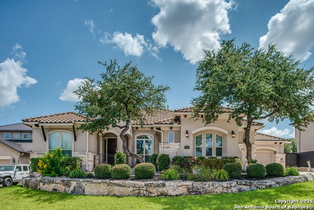 Luxury One-Story Home with Pool, Spa, Media Room & Designer Upgrades Near Camp Bullis. Welcome to this exceptional one-story custom home, offering over 3,800 sq. ft. of refined living space on a beautifully landscaped lot near Loop 1604 and Camp Bullis. Built in 2016, this residence is packed with upscale features, designed for both comfort and entertaining. Boasting 4 spacious bedrooms, each with its private en-suite bathroom and shower-plus a guest powder room, this home offers ideal functionality for families and multigenerational living. Step through the marble entryway into a home filled with elegant touches, including tile and wood floors throughout, wood-beamed ceilings in the primary suite and office, custom shutters throughout, and built-in shelving in the living area. The chef's kitchen opens into a grand living space, flanked by a game room and a dedicated media room featuring a 100" projection screen and projector (included). The primary suite features a Jacuzzi bath and a custom walk-in closet. Additional highlights include a Saltillo tile roof, 3-car garage, speaker system inside and outside, a security system, and a smart irrigation system. Outside, enjoy your retreat complete with a heated in-ground pool and hot tub, a covered patio with retractable blinds, a built-in gas grill, an outdoor fireplace, and a custom putting green-the ultimate setup for relaxing or entertaining year-round. This beautifully maintained, move-in-ready home delivers comfort, elegance, and lifestyle in one of San Antonio's most desirable areas.