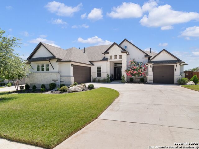 Discover modern luxury and timeless elegance in this thoughtfully designed residence nestled in the heart of Cibolo Canyons. Built by Chesmar Homes, this predominantly single-story layout showcases a seamless open floor plan with soaring ceilings, expansive living areas, and elevated finishes throughout. At the core of the home is a chef's kitchen featuring a gas cooktop, dual islands, stainless steel appliances, a custom backsplash, and abundant cabinetry, all open to the spacious living room with vaulted, beamed ceilings and a statement fireplace. The private primary suite offers a serene retreat, complete with a spa-like bath featuring upgraded wall treatments, designer lighting, dual vanities, a garden tub, and a built-in TV. All guest bedrooms on the main floor include en suite baths, large closets, and upgraded carpet. Upstairs, a spacious game room and a fully equipped media room provide flexible living space with surround sound, projector readiness, and a powder bath. The media room also includes a walk-in closet, offering the potential to be converted into a fifth bedroom if desired. Step outside to a tranquil backyard oasis with a covered patio featuring surround sound, a built-in stainless steel gas grill and fridge, and a floor-to-ceiling stacked stone fireplace. A custom platform accommodates a BBQ pit, with an additional pad on the side yard for trash bin storage. The home backs onto a wooded greenbelt, enhancing the privacy and natural beauty of the setting. Residents of this sought-after community enjoy exclusive access to two resort-style pool and clubhouse facilities, each with unique amenities. In addition, homeowners receive discounted membership opportunities to TPC San Antonio, home to two championship golf courses. Additional enhancements include a backup generator, solar panels, a water softener system, reverse osmosis filtration, an electric car charging outlet, extended driveway, professional landscaping with added trees and shrubbery, upgraded lighting and hardware throughout, a security camera system, and a premium refrigerator. This home also includes a custom mudroom, enhanced attic access and storage, upgraded shelving throughout, and a variety of thoughtfully selected finishes designed for modern luxury. This exceptional residence blends refined design with everyday functionality and offers a truly elevated living experience in one of San Antonio's premier communities.