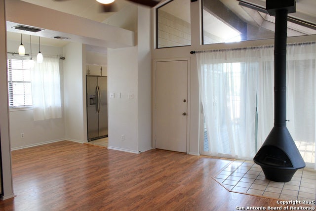 Welcome to your private treehouse retreat. This rare standalone condo offers the privacy of no shared walls and an airy second-floor layout that feels like a hidden sanctuary. Step up to your oversized private patio with skylights-perfect for morning coffee or evening gatherings. Inside, vaulted ceilings and large windows fill the home with natural light. A freestanding Malm fireplace anchors the living room with both style and warmth, while the updated kitchen features granite counters, stainless steel appliances, and a pass-through window to the patio for effortless entertaining. A versatile flex space with French doors to the patio makes an ideal breakfast nook, studio, or workspace. The spacious bedroom provides room for a reading nook or office, with a walk-in closet featuring custom shelving. Community amenities include a pool (visible from your patio), and the location offers quick access to the Medical Center, USAA, UTSA, shopping, and dining. I10 and 1604 in minutes, quick access to Wurzbach Pkwy. This condo isn't just a home-it's a lifestyle of privacy, ease, and style.