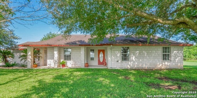 This charming 3-bedroom, 2-bath, single-story home is situated on a spacious 5.1-acre lot. Enjoy spacious acreage with plenty of room to walk, bike, or ride a golf cart, or simply take in the natural surroundings. It's a great space for pets, with room for dogs or cats to run freely. The exterior is finished in durable and attractive casi stone on all sides. The property backs up to a high game fence with exotic animals and is set 500 feet from the road with no neighbors, offering exceptional privacy and quiet. The home boasts 1,803 square feet of living space, along with a 400-square-foot insulated double garage. Step into comfort and warmth in the spacious open-concept living area that seamlessly connects to the kitchen and dining spaces, offering the perfect blend of comfort, functionality, and country charm. The vaulted ceiling adds architectural character, while the neutral tones create a warm and inviting atmosphere. A cozy fireplace anchors the living room, complemented by a large wall-mounted TV and plenty of space for gatherings or quiet evenings at home. Enjoy beautiful views from the double windows in the living room, overlooking the stocked pond with a fountain. The living area flows into a bright, functional kitchen featuring white cabinetry, a breakfast bar, and a central island ideal for casual dining or entertaining guests. The owner's suite is a true retreat, complete with an ensuite bath offering dual vanities, a garden tub/shower combo, and separate multi-closet storage. Step outside to the beautiful covered patio with ceiling fans that overlooks the wide, open backyard - perfect for outdoor dining, relaxation, or enjoying views of the tranquil pond and visiting wildlife such as deer, turkey, and birds. The pond is stocked with Rio Grande perch, goldfish, bass, and more, and includes electricity and a fountain. Additional highlights include a 2-car attached side-entry garage, an expansive 40-foot RV cover, and an adjacent 4-car carport with a workshop, ideal for hobbies, storage, or work-from-home needs. A 15-gallon-per-minute water well provides ample water for the home, irrigation, and to keep the pond full. Located within a few miles of the IH-10 boat ramp and the Guadalupe River, and just minutes from TLU College's facilities, walking track, and pool, this property is a rare find offering space, serenity, and versatility - just waiting for you to call it home.