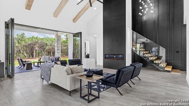 Modern Architecture. Hill Country Elegance. A Masterpiece of Design. Behind a private electronic gate on Scenic Loop, a world of refined luxury unfolds. This newly constructed architectural showpiece rests on a pristine 5-acre estate, seamlessly blending the serene beauty of the Texas Hill Country with sleek contemporary design-perfectly situated just minutes from upscale shopping and dining. A concrete circular driveway leads to an oversized three-car, side-entry garage, setting the tone for the home's grand entrance. Nine-foot custom glass doors open to soaring interiors where 20-foot ceilings, exposed beams, cove lighting, and a dramatic floor-to-ceiling black tile fireplace with a floating staircase create an unforgettable first impression. At the heart of the home lies a chef's kitchen featuring Miele's renowned luxury appliances, celebrated worldwide for precision engineering, elegant design, and culinary innovation. Gorgeous granite countertops, custom wood cabinetry, and a central island offer both style and functionality. A built-in 55-inch double-door refrigerator, a high-performance ice maker, and a commercial-grade six-burner gas cooktop make this kitchen as practical as it is stunning. The private owner's retreat is a sanctuary of calm, offering spa-inspired features such as an oversized glass-enclosed shower with multiple spray heads, a luxurious, and a generous walk-in closet complete with stackable washer and dryer. Expansive folding glass doors blur the lines between indoor and outdoor living, opening to two covered patios and a custom outdoor kitchen-creating the ultimate space for dining and entertaining. A secondary bedroom with en suite bath is conveniently located on the first level, while the second floor boasts a spacious game room and bar area, along with two additional bedrooms one with ensuite bath and a secondary guest bath. Horses are welcome, adding a rare lifestyle opportunity to this extraordinary estate.