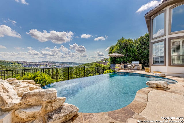 Step into luxury living with this Toll Brothers built estate located in the highly sought after gated community of Sonoma Verde. This is not your average listing. This is a statement home. With over 4500 square feet of elevated design and craftsmanship, 18210 Branson Falls is where elegance, comfort, and jaw dropping views come together in a way that stops buyers in their tracks. From the moment you pull up, the curb appeal sets the tone. Meticulously manicured landscaping, grand stone and stucco exterior, and a clay tile roof built to last decades. It is the kind of presence that commands attention. Walk through the front door and the high ceilings, natural light, custom plantation shutters and blinds, and grand staircase welcome you with serious wow factor. Every inch of this home was built to impress. It features four spacious bedrooms, plus a full sized dedicated office downstairs that offers a true work from home setup without sacrificing a bedroom. The luxurious primary suite is tucked away on the main floor and feels like a private retreat. The primary bath features dual vanities, a jetted tub, separate shower, and a walk in closet that can handle the wardrobe of someone who lives big. Upstairs, the home continues to deliver with a massive game room, oversized media room equipped with projector and screen, and three additional large bedrooms with ample closet space. The kitchen is a showstopper. Forty two inch cabinets, double oven, gas cooktop, expansive island, and open sightlines that make entertaining seamless. Whether it is a holiday dinner or casual breakfast, this kitchen is where everyone will want to gather. The open layout flows effortlessly into the living area, complete with fireplace, custom finishes, and a wall of windows looking out to your private slice of heaven. Now let's talk about the backyard. This is the one. Hands down one of the best views in all of San Antonio. You get bluff top scenery that stretches for miles, and it is all yours. Step outside and it feels like you have been transported to a luxury resort. The backyard features a custom pool with waterfall feature, built in outdoor kitchen, flagstone patio, wrought iron fencing, and lush landscaping that creates the kind of outdoor space that makes you want to entertain every weekend. Sunrise coffees, sunset dinners, late night swims. You can live outside here and never get tired of the view. Additional features include a water softener system, updated water heaters, main floor laundry room with natural light, private study with French doors, and a spacious three car garage. Every detail has been thought through. This home is not just beautiful. It is functional, practical, and built for someone who lives with intention and style. The Ridge at Sonoma Verde is one of the premier gated communities in the city. You are zoned to top tier NISD schools, minutes from La Cantera, The Rim, golf courses, and major employers, yet tucked away enough to enjoy peace and privacy. When people say location is everything, this is what they mean. This home checks every box. Luxury build. Immaculate condition. Elite neighborhood. And that view. This is not a listing that gets overlooked. This is the one they remember. Serious buyers only. This is where elevated living begins.