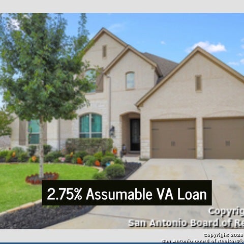 Seller offering 2.75 assumable VA loan, A huge savings for eligible buyers! Motivated seller. This spacious 3,681 sq ft energy-efficient home in Cibolo Canyon offers a perfect blend of comfort, convenience, and modern upgrades. The expansive 2,696 sq ft first floor features all ceramic tile, a large entryway, a media room, and an open-concept living area with a cozy fireplace. The impressive island kitchen, complete with a gas stove and breakfast area, seamlessly connects to the living room, making it perfect for entertaining. A sunroom, all sides finished in brick, perfect for low maintenance and lasting durability with a smart TV that conveys overlooks a serene greenbelt. Extra added security with a lock to the sunroom door and window. This floor also includes a secondary bedroom, a study/office, and a convenient laundry room with access to the large, extended primary bedroom's closet. Upgrades like laminate flooring on the staircase, in the game room, hallway and closet, Ceramic tile added to the sunroom, pendant lighting, ceiling fans, All exterior four sides BRICK with front white stone blend, and an EV outlet in the tandem 3-car garage add to the home's appeal. Take advantage of the builders remaining warranty. Inside you will value the energy-efficient design that keeps monthly electric bills under $300. Also the owner is offering a home warranty. The second floor boasts a game room with a built-in bench, overlooking the living room and kitchen below, along with two bedrooms that share a Jack and Jill bathroom. One of the bedrooms has an L-shape, providing unique character. The backyard is enclosed by a wrought iron fence, with a natural trail walkway just down the street. The home is also conveniently located near the Marriott TPC golf course, making it ideal for golf enthusiasts. Icing on the cake is the amenities, which include a lazy river, pools, soccer field, b-ball court, gym and an incredible clubhouse.