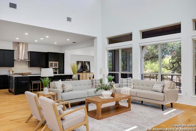 Nestled on over a quarter-acre, garden home lot in a quiet cul-de-sac, this stunning Spanish-style home offers a balanced appeal of modern luxury and timeless design. From the moment you step through the impressive entryway, you're welcomed by soaring 22-foot ceilings and an abundance of natural light that fills every corner. The heart of the home is a spacious, modern kitchen featuring a dramatic 12.5-foot island, sleek stainless steel appliances, modern fixtures, Quartz countertops, and bold black cabinetry. Hidden under-cabinet electrical outlets and charging stations, and built-in Legrand home stereo elevate both form and function. Designed with flexibility in mind, the oversized study provides an ideal space for work or creativity, or could be enjoyed as a media or game room. The expansive primary suite is a true retreat, tucked away from the other rooms for added privacy, and is complete with two oversized walk-in closets and a spa-like bathroom with separate vanities, modern upgrades, and a large walk-in shower. Each spacious secondary bedroom offers the privacy of their own ensuite bath and perfectly accommodate loved ones or guests. Step outside to a large, breezy covered patio, highlighted by a wood-panel ceiling and serene greenbelt views, all framed by over a dozen mature oak trees that surround the property. Located in a controlled-access community, residents enjoy exclusive access to a private neighborhood center featuring a pool, tennis and pickleball courts, nature trails, and scenic jogging trails - all just minutes from Highway 281 and Loop 1604. Schedule your private tour today and discover why this home is the perfect place to live, relax, and enjoy.