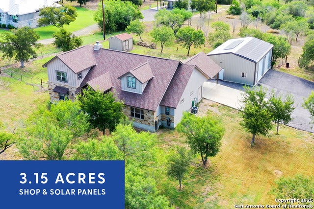Welcome to this stunning RD Custom Home located at 2891 FM 465, Seguin, TX 78155, offering the perfect blend of modern luxury and Texas charm. Situated on 3.25 acres, this 3-bedroom, 3-bathroom home spans 3,028 sq. ft. and is designed for comfort and functionality. The open-concept living room flows seamlessly into the gourmet island kitchen, which boasts custom cabinetry, granite countertops, a glass cooktop, stainless steel appliances, and a double oven, ideal for entertaining and everyday living. The spacious primary suite features a private sitting area, spa-inspired bath with double vanity and walk-in shower, and plenty of natural light. Energy efficiency is top-of-mind with solar panels and battery backup, while outdoor living shines with an extended covered patio and a wrap-around porch perfect for enjoying Hill Country sunsets. Additional highlights include a detached two-car garage, generous storage, and beautifully designed interiors with high ceilings and wood accents.This property offers a peaceful retreat with easy access to the conveniences, schools, and amenities of nearby Schertz, Cibolo, Seguin, and New Braunfels, all within a comfortable driving distance.