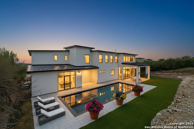 Seller motivated! Where Architectural brilliance meets the edge of the sky. There are homes you see - and homes you remember. Perched high in the prestigious Canyons at Scenic Loop, 9614 Ivory Canyon is unforgettable. It rises from the hillside like a modern sculpture, its crisp white stucco, horizontal limestone, and standing-seam metal roof glowing under the Texas sun by day and shimmering under architectural uplighting by night. From the moment you arrive, the horizon becomes yours - an uninterrupted 180 panorama of Hill Country beauty, visible from nearly every room. Step through the custom pivoting glass front door into a two-story foyer where a floating oak staircase rises beside a dramatic bookmatched marble fireplace. Natural light pours into the great room and dining space, where remote-controlled blinds, high-gloss cabinetry, and wide-plank oak floors showcase the thoughtful balance of elegance and ease. The chef's kitchen is a work of art, outfitted with a full suite of Bosch appliances - including a WiFi-enabled oven - waterfall-edge Calacatta quartz island, and a concealed walk-in pantry doubling as a prep kitchen. The primary suite is a private sanctuary designed to soothe, with floor-to-ceiling windows, boutique-style dual closets, and a spa bath wrapped in marble slabs featuring dual rainfall showers and a freestanding soaking tub. A main-level guest suite with its own living area and ensuite bath provides unmatched privacy for family or long-stay guests. Upstairs, a massive game/theater room with wet bar, storage, invites gatherings both casual and grand. Smart-home wiring throughout - including Control 4 compatibility, iPad wall controllers, and whole-home audio - ensures technology and comfort are always at your fingertips. This is a home where every detail is intentional - from remote blinds and 8-zone audio and zoned HVAC. Just six minutes from daily conveniences and 15 minutes from The Rim, yet wrapped in the quiet grandeur of the Hill Country, this home offers more than luxury - it offers presence. 9614 Ivory Canyon isn't just a home - it's a statement. Modern, bespoke, barely lived in, and built for those who demand elegance without sacrificing comfort. Schedule your private tour today and experience the harmony of design, technology, and livability this home uniquely delivers.