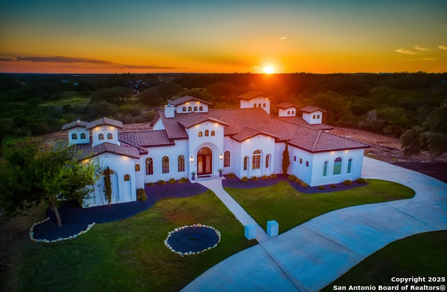 A True Custom Modern Mediterranean Villa sitting on nearly 2 acres within the exclusive Briggs Ranch Golf Course Community. This single-story Mediterranean estate blends timeless architectural detail with modern luxury. Adjacent to the private, Tom Fazio-designed 18-hole Briggs Ranch Golf Club, the residence embodies resort-style living in a world-class golf destination. Arrive through a circular motor court leading to a 3-car garage and grand entry. Inside, the expansive living room is framed by a 10-foot wall of windows overlooking the sweeping backyard. Five custom-designed cupolas bring natural light throughout the estate. The gourmet kitchen features a tray ceiling, tiered custom cabinetry, walk-in pantry, top-line stainless appliances, and an oversized dine-in island with seating for seven. The South Wing primary suite is a private retreat, accessed through a dramatic gallery foyer. It offers a full wall of windows with motorized blinds, a spa bath with dual vanities, framed mirrors, built-in vanity seating, and a locally sourced crystal chandelier above the oversized soaking tub. The walk-through shower is a room of its own, finished in stone inlays with dual showerheads, including waterfall features. A massive closet offers floor-to-ceiling shelving and custom storage. A rear study with a barrel ceiling provides serene backyard views, while the Western wing includes two spacious ensuite bedrooms plus a flex 4th bedroom / game room with full ensuite bath, coffered ceiling, rope lighting, wet bar, and private patio access. Outdoor living shines with an oversized covered patio, finished with knotty-stained wood plank ceilings, speakers, and specialty lighting-perfect for Texas sunsets. Architectural plans are available for a pool, spa, and outdoor kitchen.