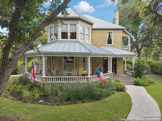 Sitting on a 0.38-acre corner lot in King William is where you'll find this impressive, gated residence that includes a +/- 3000 square foot, 3- bedroom, 2-bath Victorian Queen Anne main house, sparkling pool and spa, full outdoor kitchen and recently constructed 2-car detached garage with an 800 square foot 1-bedroom, 1-bath apartment above. The main house, originally built in 1885 by George A. Chabot, features a brick masonry ground floor, a staggered square shingle on the second and is distinguished by its hexagonal porch overlooking the neighborhood on its exterior. Inside, the home effortlessly combines historic charm and noteworthy architectural details alongside an open floor plan featuring updated kitchen and baths. One of the two well-appointed living rooms greets you off its dramatic front porch and entry, where you start to discover just a few of the details that make this home unique including long-leaf pine floors, crown molding, rich paneling and custom millwork. Just beyond it, the home's large, formal dining room draws you in with its rich wainscotting, coffered ceiling and charming tiled fireplace. A Victorian Stick and Ball Arch frames the home's second, well-lit living area, featuring a wall of windows, additional tiled fireplace and mantel, and diamond-muntin-windowed seating alcove. A handsome, built-in wine bar invites you into the beautifully updated, eat-in kitchen with granite countertops, stainless steel appliances and custom cabinetry. A full bath and laundry room complete the first-floor layout. A grand, antique wooden staircase with elaborate newel post and carved balusters leads you up to a transom and diamond-muntin window lined second story. The primary bedroom is just off the landing and boasts its own fireplace, wall of windows and long leaf pine hardwoods. The upstairs full bath is adjacent and has separate shower and tub, dual vanities and large walk-in closet. Across the hall, you'll find two additional, ample-sized secondary bedrooms, one with its own private sitting room looking over Madison Street. Outside, the well-manicured backyard features a beautiful pool and spa, full outdoor kitchen under an octagonal gazebo and several finished outdoor living and dining areas. Added in 2017, the detached garage boasts an 1 bedroom/1 bath apartment with all modern amenities and finishes. Outside of the property, you'll find yourself in the center of the urban chic and historic King William neighborhood - close to some of the finest restaurants and bars in town, a block away from the San Antonio Riverwalk, and within walking distance to HemisFair Park. There's so much to see and appreciate in this listing. Schedule your showing today.