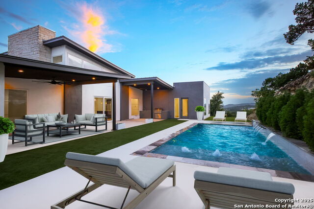 Tucked away on over half an acre in the prestigious Canyons at Scenic Loop, this stunning one-story Hill Country retreat offers breathtaking, unobstructed views and unmatched privacy. Perfectly positioned to provide the serenity of country living with the convenience of city access, this home is a rare gem. Step inside to an open-concept layout featuring clean contemporary lines, soaring ceilings, and walls of windows that flood the space with natural light and frame picturesque views of the sparkling pool.